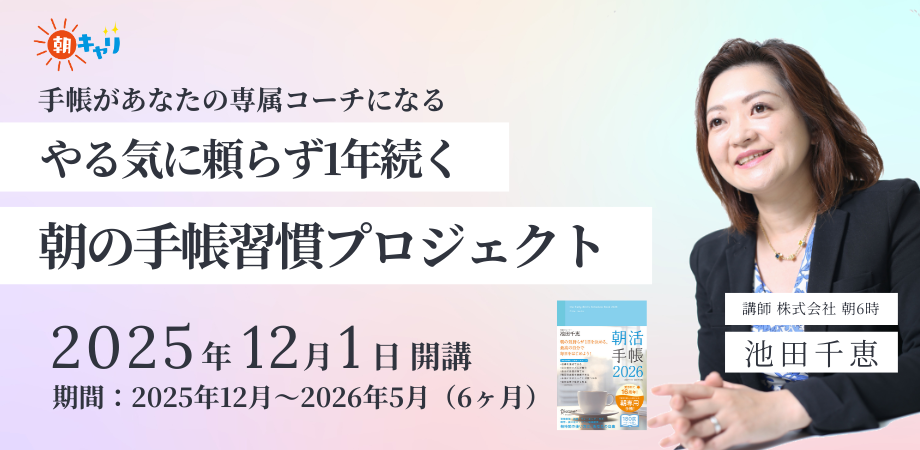 『朝活手帳』シリーズを2009年から16年にわたりプロデュース。延べ10万人以上が手に取り、「朝の時間で人生を変える」文化をつくってきた池田千恵が、その知見をすべて注いで開発したのが、この「朝の手帳習慣プロジェクト」です。長年の読者・受講者の声から見えてきたのは、「やる気よりも仕組み」「手帳を使ったセルフコーチング」が人生を動かす鍵になるということです。
